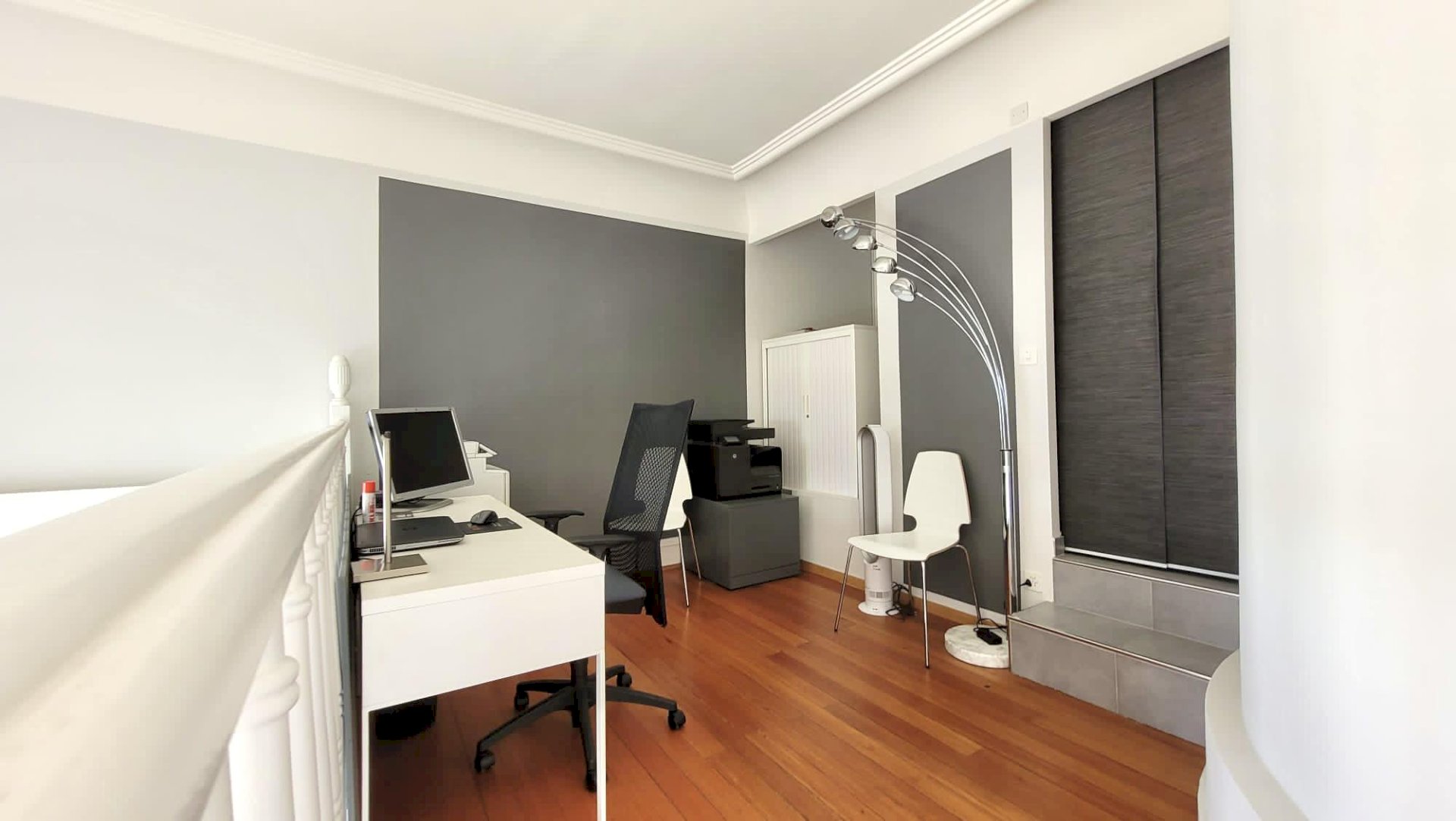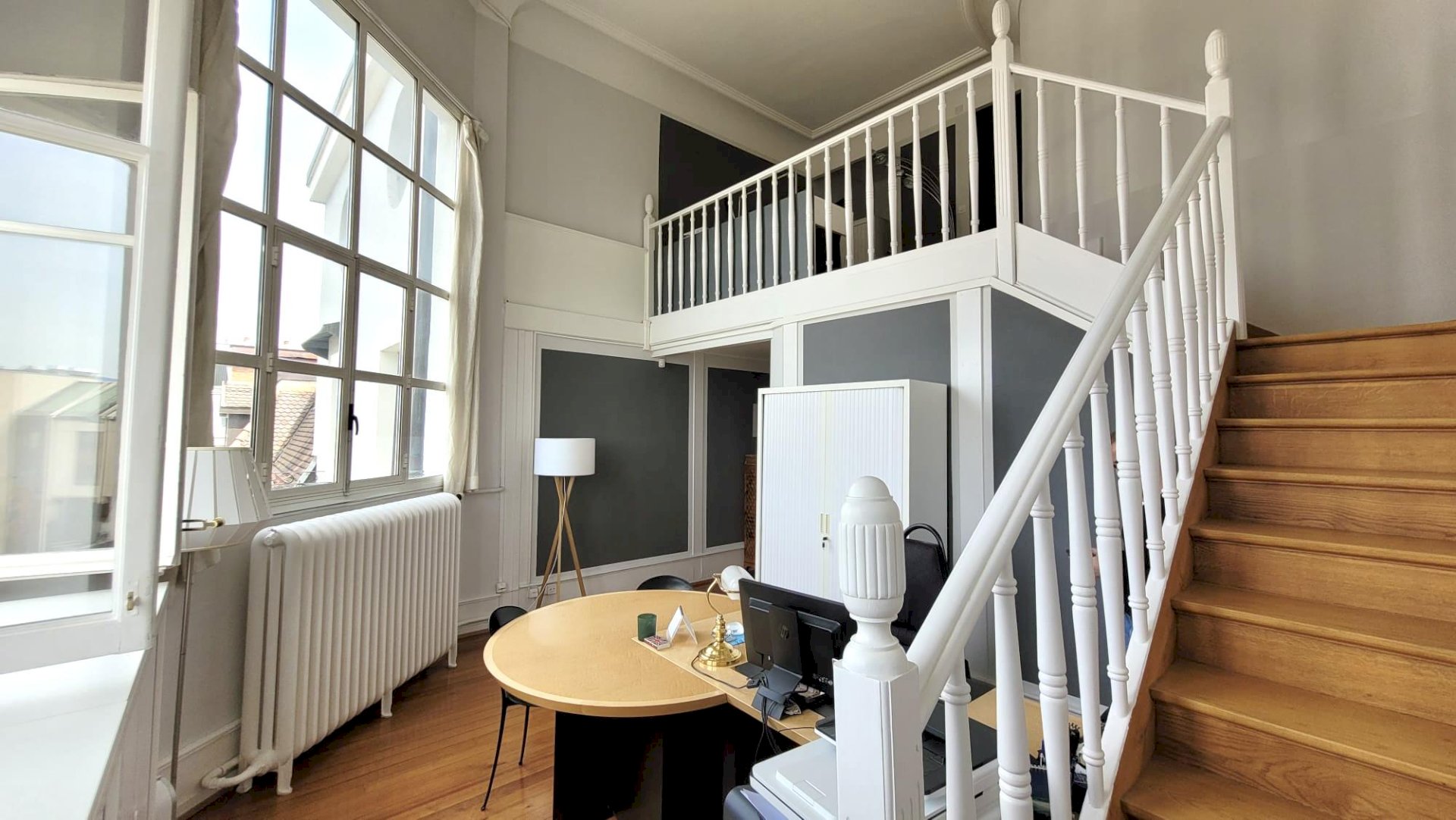 It comprises a 19 m2 workspace with a ceiling height of 5.50 m, a kitchenette, a storeroom, a bathroom, as well as a mezzanine of 14 m2 including a shower room.