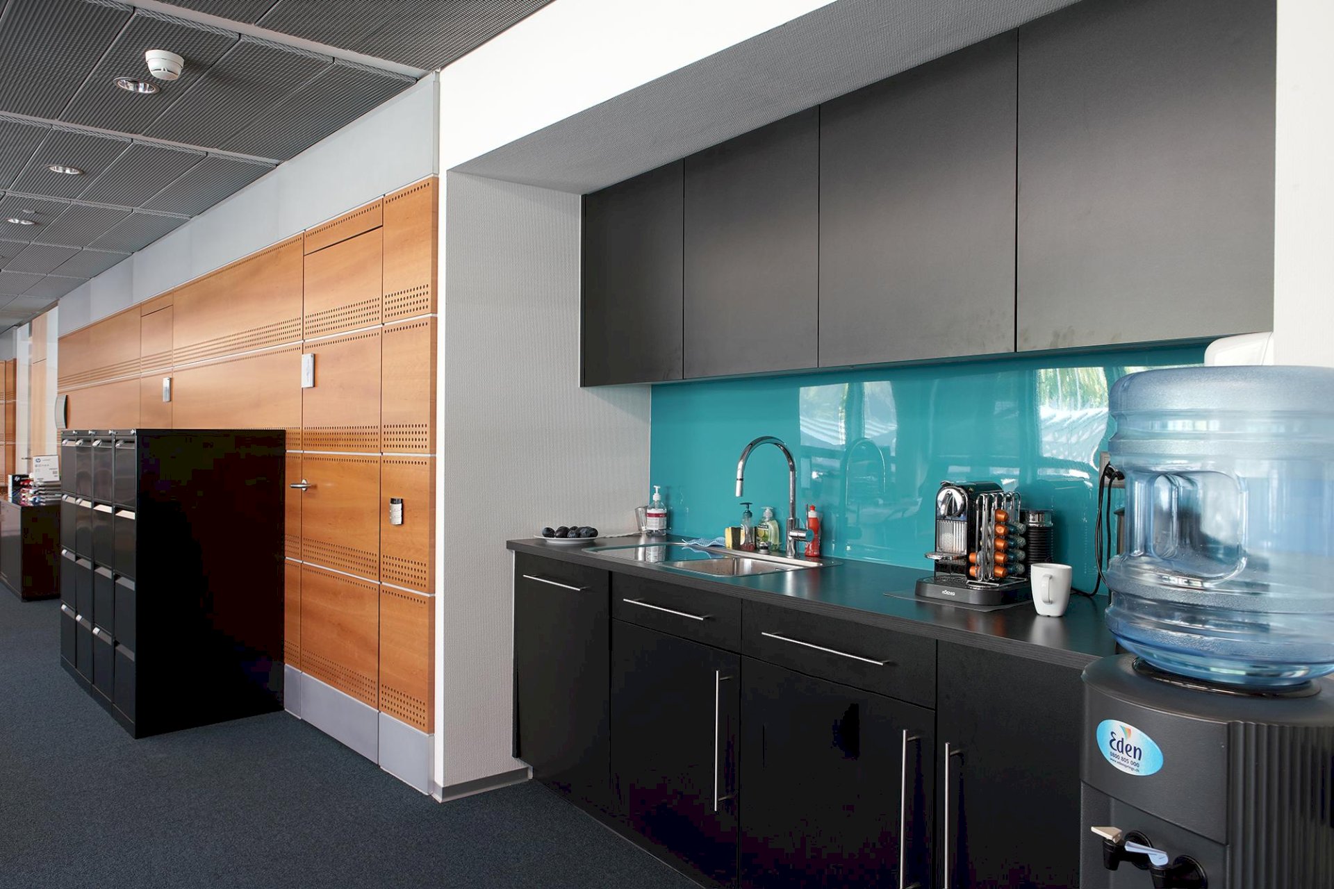 The premises are fully fitted and include an open-space area, one private office, a conference room, a kitchenette, and two double restrooms.