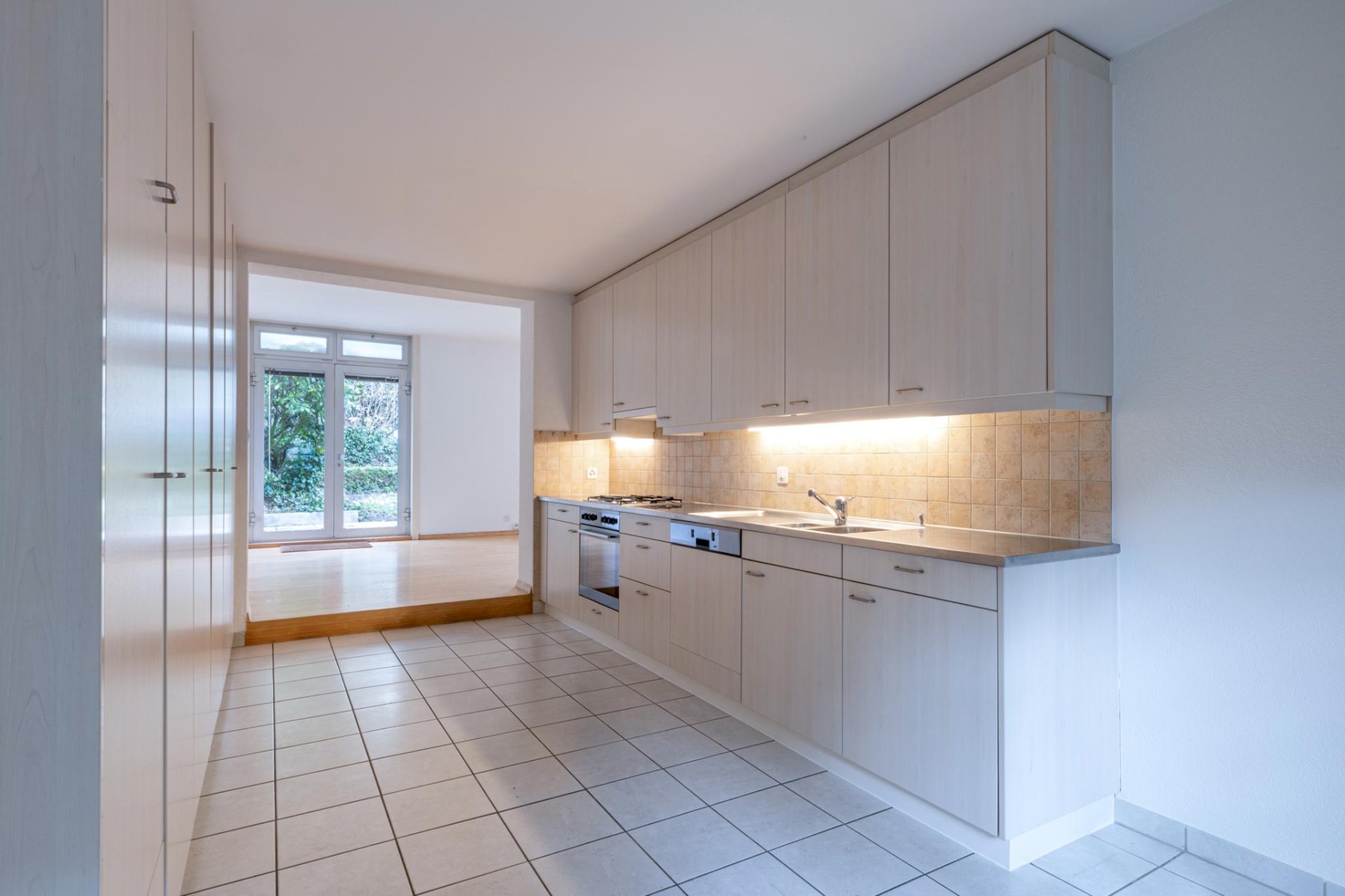 Ground floor: Fully equipped kitchen (hob, oven, extractor hood, dishwasher) with dining area, living room, access to the garden, storage room.